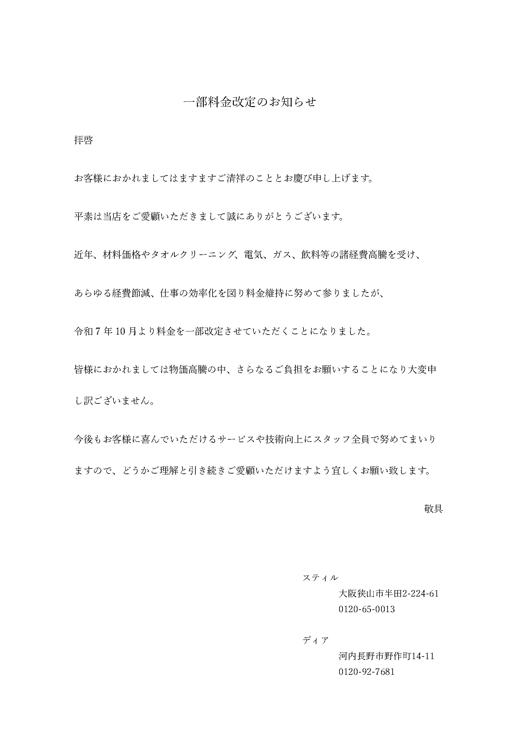| 2025年7月10日 10月より一部料金を改定させていただきます。 |